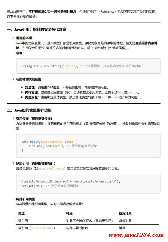一、Java引用:指针的安全替代方案 1. 引用的本质 Java中的对象变量(非基本类型)都是引用类型,存储对象在堆内存中的地址,但无法直接操作内存地 址。引用仅允许通过.运算符访问对象属性和方法,禁止指针运算(如地址偏移)。 示例: