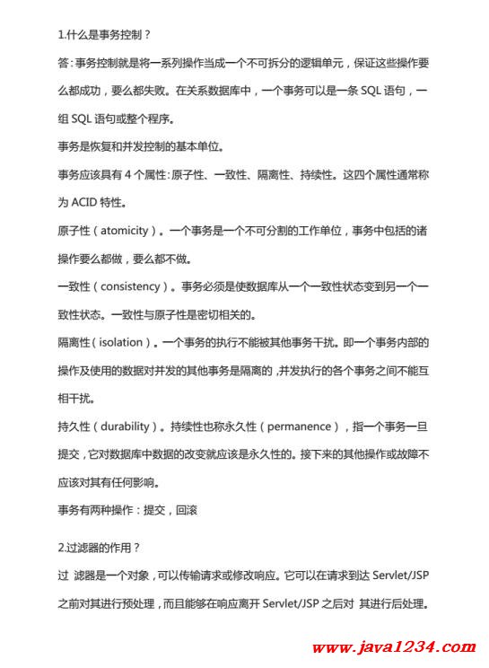 1.什么是事务控制? 答:事务控制就是将一系列操作当成一个不可拆分的逻辑单元,保证这些操作要么都成功,要么都失败。在关系数据库中,一个事务可以是一条SQL语句,一组SQL语句或整个程序。 事务是恢复和并发控制的基本单位。 事务应该具有4个属性:原子性、一致性、隔离性、持续性。这四个属性通常称 为ACID特性。 原子性( atomicity ) 。一个事务是一个不可分割的工作单位,事务中包括的诸操作要么都做,要么都不做。 一致性( consistency )。事务必须是使数据库从一个一致性状态变到另一个一 致性状态。一致性与原子性是密切相关的。 隔离性( isolation )。一个事务的执行不能被其他事务干扰。即一个事务内部的操作及使用的数据对并发的其他事务是隔离的,并发执行的各个事务之间不能互相干扰。 持久性( durability )。持续性也称永久性( permanence ),指一个事务一旦提交,它对数据库中数据的改变就应该是永久性的。接下来的其他操作或故障不应该对其有任何影响。