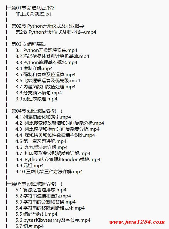 ![]() 资料目录: ├─第01节 薪选认证介绍 │ 非正式课 跳过.txt │ ├─第02节 Python开班仪式及职业指导 │ 第2节 Python开班仪式及职业指导.mp4 │ ├─第03节 编程基础 │ 3.1 Python开发环境安装.mp4 │ 3.2 冯诺依曼体系和计算机基础.mp4 │ 3.3 Python编程基本概念.mp4 │ 3.4 进制详解.mp4 │ 3.5 码制和算数及位运算.mp4 │ 3.6 比较逻辑运算及优先级.mp4 │ 3.7 内建函数和数值处理.mp4 │ 3.8 分支循环语句.mp4 │ 3.9 线性表原理.mp4 │ ├─第04节 线性数据结构(一) │ 4.1 列表初始化和索引.mp4 │ 4.2 列表搜索修改新增和时间复杂分析.mp4 │ 4.3 列表模型和操作时间复杂度分析.mp4 │ 4.4 深浅拷贝和线性数据结构对比.mp4 │ 4.5 第一章习题讲解.mp4 │ 4.6 九九乘法表详解.mp4 │ 4.7 打印图形斐波那契质数详解.mp4 │ 4.8 Python内存管理和random模块.mp4 │ 4.9 元祖.mp4 │ 4.10 三数比较三种方法详解.mp4 │ ├─第05节 线性数据结构(二) │ 5.1 算法之冒泡排序.mp4 │ 5.2 字符串连接和查找.mp4 │ 5.3 字符串的分割和替换.mp4 │ 5.4 字符串的移除判断格式化.mp4 │ 5.5 编码与解码.mp4 │ 5.6 bytes和bytearray及字节序.mp4 │ 5.7 切片.mp4 │ 5.8 作业求素数详解.mp4 │ 5.9 作业杨辉三角三种方法精讲.mp4 │ 5.10 作业字符串统计精讲.mp4 │ ├─第06节 哈希表(一) │ 6.1 Python使用.mp4 │ 6.2 set集合.mp4 │ 6.3 set集合运算.mp4 │ 6.4 字典1.mp4 │ 6.5 字典2.mp4 │ 6.6 封装和解构.mp4 │ ├─第07节 哈希表(二) │ 7.1 作业猴子吃桃杨辉三角数字统计详解.mp4 │ 7.2 集合字典解构习题讲解.mp4 │ 7.3 选择排序精讲.mp4 │ 7.4 列表解析式和生成器表达式.mp4 │ 7.5 集合和字典解析式.mp4 │ 7.6 内建函数和迭代器.mp4 │ ├─第08节 函数(一) │ 8.1 函数基本概念.mp4 │ 8.2 实参传参和形参缺省值.mp4 │ 8.3 可变形参和keyword-only参数.mp4 │ 8.4 positional-only.mp4 │ 8.5 函数习题精讲.mp4 │ 8.6 作用域和分类.mp4 │ 8.7 嵌套作用域和赋值问题.mp4 │ 8.8 global、nonlocal和闭包原理.mp4 │ ├─第09节 函数(二) │ 9.1 默认值作用域.mp4 │ 9.2 LEGB和匿名函数.mp4 │ 9.3 函数调用原理和递归.mp4 │ 9.4 插入排序.mp4 │ 9.5 生成器函数.mp4 │ 9.6 树.mp4 │ 9.7 高阶函数和Sorted原理.mp4 │ ├─第10节 高阶函数装饰器(一) │ 10.1 递归习题精讲.mp4 │ 10.2 上下三角打印精讲.mp4 │ 10.3 柯里化和无参装饰器.mp4 │ 10.4 带参装饰器.mp4 │ 10.5 wraps本质和装饰器进阶.mp4 │ 10.6 类型注解和inspect使用.mp4 │ 10.7 参数检查装饰器实现.mp4 │ ├─第11节 高阶函数装饰器(二) │ 11.1 functools.mp4 │ 11.2 lru_cache应用.mp4 │ 11.3 lru_cache原理.mp4 │ 11.4 磁盘原理和文件对象.mp4 │ ├─第12节 文件IO和文本处理(一) │ 12.1 文件打开模式和指针操作.mp4 │ 12.2 缓冲区、编码、新行处理.mp4 │ 12.3 上下文和类文件对象.mp4 │ 12.4 正则表达式基础.mp4 │ 12.5 正则分组和断言.mp4 │ 12.6 正则贪婪非贪婪和单行多行模式.mp4 │ 12.7 os.path使用.mp4 │ 12.8 Path类使用1.mp4 │ 12.9 Path类使用2.mp4 │ 12.10 shutil模块使用.mp4 │ ├─第13节 文件IO和文本处理(二) │ 13.1 base64编码详解.mp4 │ 13.2 cache的key实现.mp4 │ 13.3 cache过期实现.mp4 │ 13.4 复制作业详解.mp4 │ ├─第14节 文件IO和文本处理(三) │ 14.1 正则单次匹配.mp4 │ 14.2 正则全文搜索、替换、切割.mp4 │ 14.3 正则分组.mp4 │ 14.4 csv和ini文件处理.mp4 │ 14.5 序列化原理详解.mp4 │ 14.6 序列化本质.mp4 │ 14.7 Json格式.mp4 │ 14.8 json和msgpack序列化.mp4 │ 14.9 面向对象概述.mp4 │ 14.10 类和实例、初始化、绑定.mp4 │ ├─第15节 面向对象(一) │ 15.1 正则习题讲解1.mp4 │ 15.2 正则习题讲解2.mp4 │ 15.3 作业密码强度和配置文件转换.mp4 │ 15.4 作业单词统计详解.mp4 │ 15.5 面向对象之属性和方法本质.mp4 │ 15.6 访问控制.mp4 │ 15.7 属性装饰器和析构.mp4 │ 15.8 Python类版本差别和继承.mp4 │ 15.9 继承与访问控制.mp4 │ ├─第16节 面向对象(二) │ 16.1 初始化和覆盖与多态.mp4 │ 16.2 多继承和Mixin.mp4 │ 16.3 作业生成数字类.mp4 │ 16.4 作业坐标打印和车辆管理.mp4 │ 16.5 作业温度转换购物和形状面积计算.mp4 │ 16.6 异常产生和捕获.mp4 │ 16.7 异常继承和匹配.mp4 │ 16.8 异常finally、else子句和嵌套.mp4 │ 16.9 argparser模块.mp4 │ 16.10 PEP.mp4 │ ├─第17节 操作系统(一) │ 17.1 操作系统发展史.mp4 │ 17.2 操作系统层次.mp4 │ 17.3 分区和FSH.mp4 │ 17.4 CentOS安装和配置.mp4 │ 17.5 常用命令1.mp4 │ 17.6 常用命令2.mp4 │ ├─第18节 操作系统(二) │ 18.1 inode和文件描述符原理.mp4 │ 18.2 管道和重定向.mp4 │ 18.3 用户和权限系统.mp4 │ 18.4 grep和sed.mp4 │ 18.5 awk.mp4 │ 18.6 ip处理和VIM使用.mp4 │ 18.7 环境变量.mp4 │ 18.8 Pyenv安装配置.mp4 │ ├─第19节 面向对象进阶(一) │ 19.1 dir属性查看.mp4 │ 19.2 魔术方法之实例化.mp4 │ 19.3 魔术方法之可视化和哈希.mp4 │ 19.4 魔术方法之bool运算符重载和容器化.mp4 │ 19.5 单双链表实现1.mp4 │ 19.6 双向链表实现2.mp4 │ 19.7 魔术方法之可调用对象.mp4 │ 19.8 魔术方法之上下文管理.mp4 │ 19.9 魔术方法之上下文管理2.mp4 │ 19.10 反射.mp4 │ ├─第20节 面向对象进阶(二) │ 20.1 魔术方法之反射.mp4 │ 20.2 描述器.mp4 │ 20.3 静态方法和类方法原理.mp4 │ 20.4 描述器综合应用之参数检查.mp4 │ 20.5 链表容器化和属性装饰器实现.mp4 │ 20.6 __slots__和内存分配.mp4 │ 20.7 未实现及未实