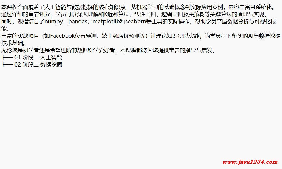 ![]() 主要内容: 本课程全面覆盖了人工智能与数据挖掘的核心知识点,从机器学习的基础概念到实际应用案例,内容丰富且系统化。 通过详细的章节划分,学员可以深入理解如K近邻算法、线性回归、逻辑回归及决策树等关键算法的原理与实现。 同时,课程结合了numpy、pandas、matplotlib和seaborn等工具的实际操作,帮助学员掌握数据分析与可视化技能。 丰富的实战项目(如Facebook位置预测、波士顿房价预测等)让理论知识得以实践,为学员打下坚实的AI与数据挖掘技术基础。 无论您是初学者还是希望进阶的数据科学爱好者,本课程都将为您提供宝贵的指导与启发。 ├── 01 阶段一 人工智能 ├── 02 阶段二 数据挖掘