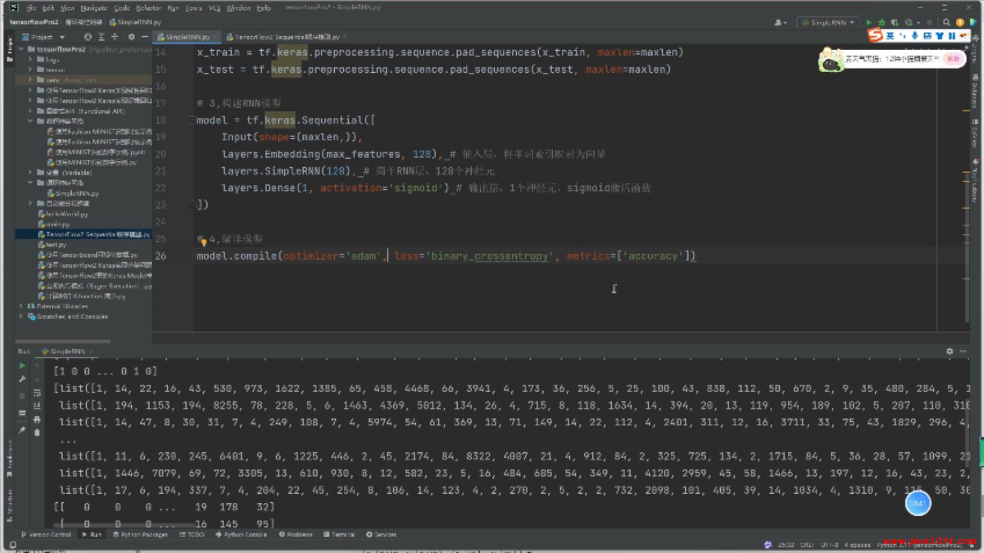 24_TensorFlow2视频教程_循环神经网络(SimpleRNN)示例 B站在线学习地址: https://www.bilibili.com/video/BV1X5xVz6E4w 高清视频+源码+文档领取: http://python222.com/post/7 相关截图: ![]() ![]() |