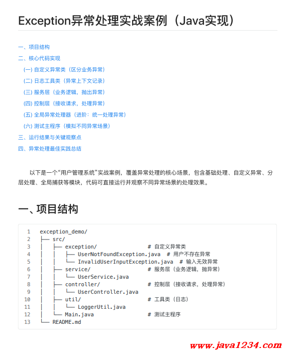 以下是⼀个“⽤户管理系统”实战案例,覆盖异常处理的核⼼场景,包含基础处理、⾃定义异常、分