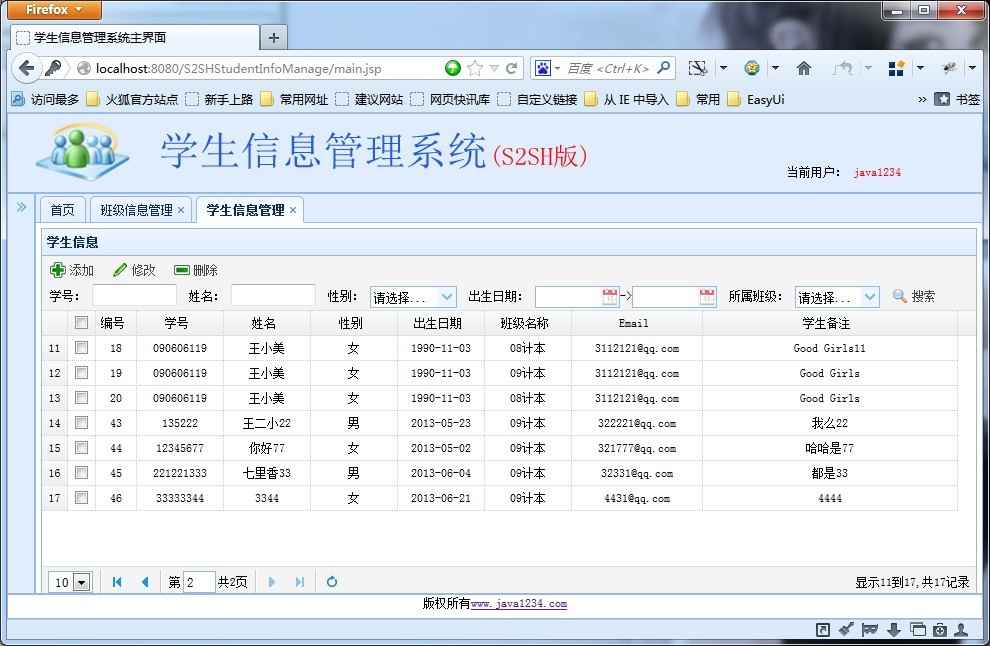 S2SH入门级项目全程实录第三讲(完结) 主要内容: 学生信息CRUD实现 一,继续体验S2SH 二,学生信息CRUD实现 S2SH入门级项目全程实录第三讲高清视频下载 S2SH入门级项目全程实录第三讲(源码)下载 优酷预览: 项目截图: ![]() ![]()
