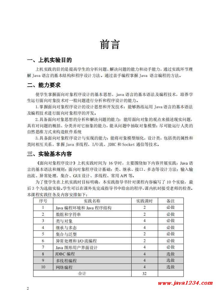 一、上机实验目的 上机实践的目的是提高学生的分析问题、解决问题的能力和动手能力,通过实践环节理 解 Java 语言的基本结构和程序设计方法。通过亲手编程掌握 Java 语言编程的方法。 二、能力要求 使学生掌握面向对象程序设计的基本思想、java 语言的基本语法及编程技术,培养学 生运行面向对象技术对一般问题进行分析和程序设计的能力。 1.掌握面向对象程序设计的设计思想和开发技术:能够熟练运用 Java 语言的基本语法 及编程技术进行面向对象程序的开发。 2.具备面向对象思想的分析和解决问题的能力:能用面向对象的观点来描述现实问题, 具有对问题的概括、分类并对它抽象的能力,能从问题中抽取对象模型;尽可能运行人类的 自然思维方式来构造软件系统 3.具备面向对象程序设计与实现的能力:能将对象模型细化,设计类,包括类的属性和 类间相互关系,掌握 Java 多线程、I/O 流、JDBC 和 Socket 通信等技术。 三、实验基本内容 《面向对象程序设计》上机实践时间为 16 学时,主要围绕如下内容开展实践:Java 语 言的基本语法和规则;面向对象程序设计基础;类、继承、接口、多态等设计方法;输入输 出流、异常处理、集合、GUI 设计、多线程、常用 API 等。 为了使学生在上机实践时目标明确,本实践指导书针对课程内容编写了 10 个实验,最 后 3 个为选做实验。学生可以在课外先完成指导书中给出的程序,课内机时接受老师的检查。 本课程实践任务及内容安排如下: |