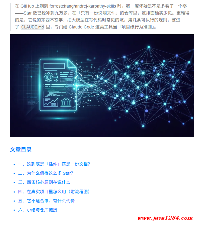 这个仓库的「本体」就是一个 CLAUDE.md 文件(外加仓库自带的说明文字)。在 Claude Code 的工作方式里,项目根目录下的 CLAUDE.md 会作为给模型的长期指令被读取——和你平时在对话里逐条「叮嘱」不同,它相当于把「团队宪章」写进了版本库里,每个会话都能继承。