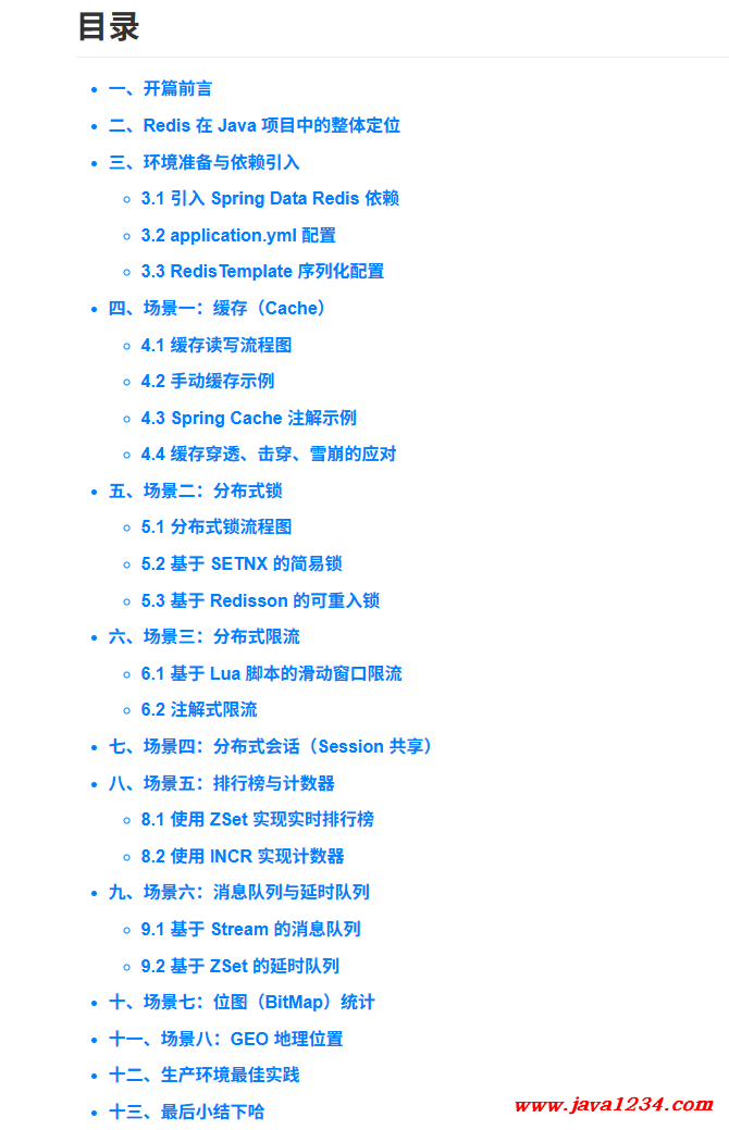 本文将结合 Spring Boot + Spring Data Redis + Redisson 技术栈,系统梳理 Redis 在 Java 项目中最常见的 8 大应用场景,并提供完整可运行的示例代码和流程图,帮助你在真实项目中落地。